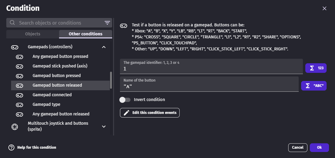 - If your game is multi player, it's a good idea to use the Gamepad connected condition to check which gamepads are connected. You could store in a variable the gamepad number associated to a player. You can also force the first player to use the Gamepad 1, and the other player to use Gamepad 2.