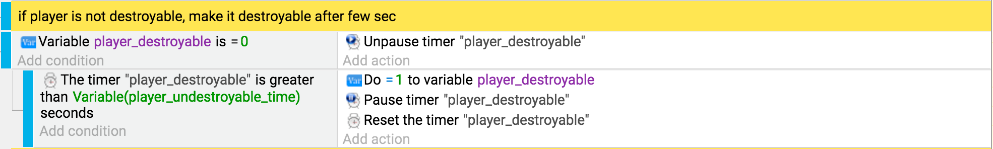 Here is a more advanced Timer example. The timer is used to briefly protect the player from damage.  The amount of time given to protect the player depends on the value of the variable "player_undestroyable_time":
