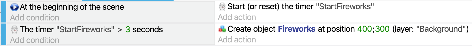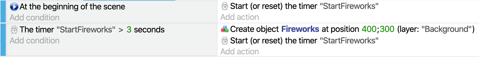 You can use the action to reset the timer to make something repeat on a regular interval. Here, we take the same example as before, but also reset the timer to 0 when it reaches 3 seconds. This allows a new "Fireworks" object to be created every 3 seconds: