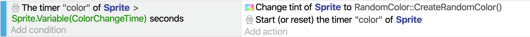 The condition above checks to see if the time elapsed in the "color" timer is greater than the value of the variable "ColorChangeTime". The condition will pick every Sprite instance with a timer value greater than the time they "request" with the object variable "ColorChangeTime". Then the Sprite color is changed to a random color and the object timer is reset.