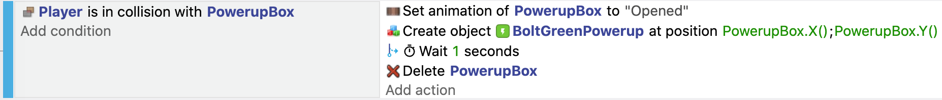 Use the action to wait a bit before launching an action. For example, here we create a power-up item when the player touches a power-up box, and then delete the box 1 second after: