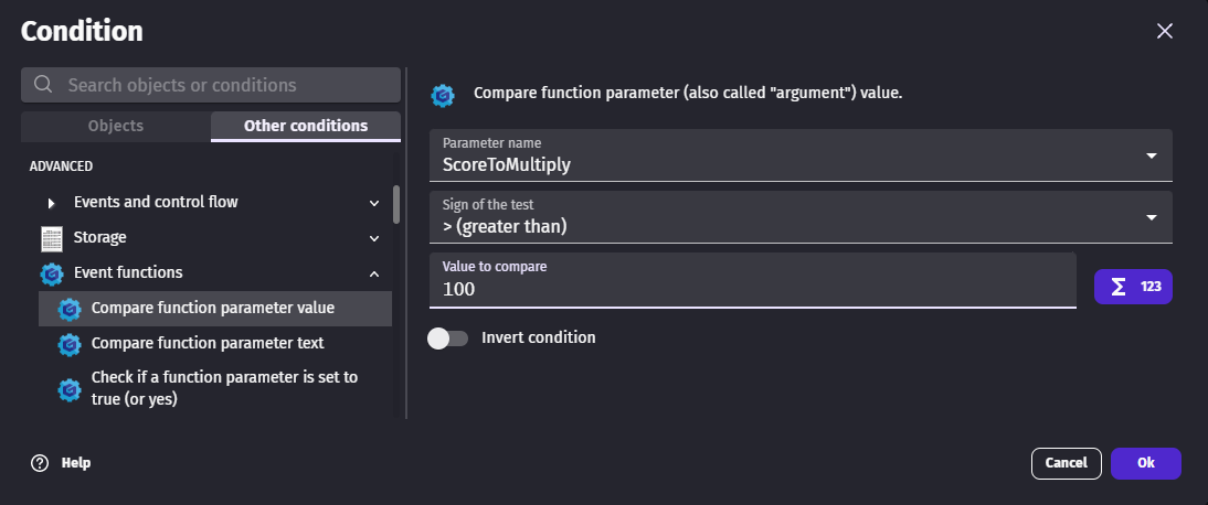 Similarly to scenes or external events, functions are written with events. They allow to create new conditions, new actions and new expressions that add up to GDevelop features. They are a good way to organize events, avoid duplication and share features with the community.