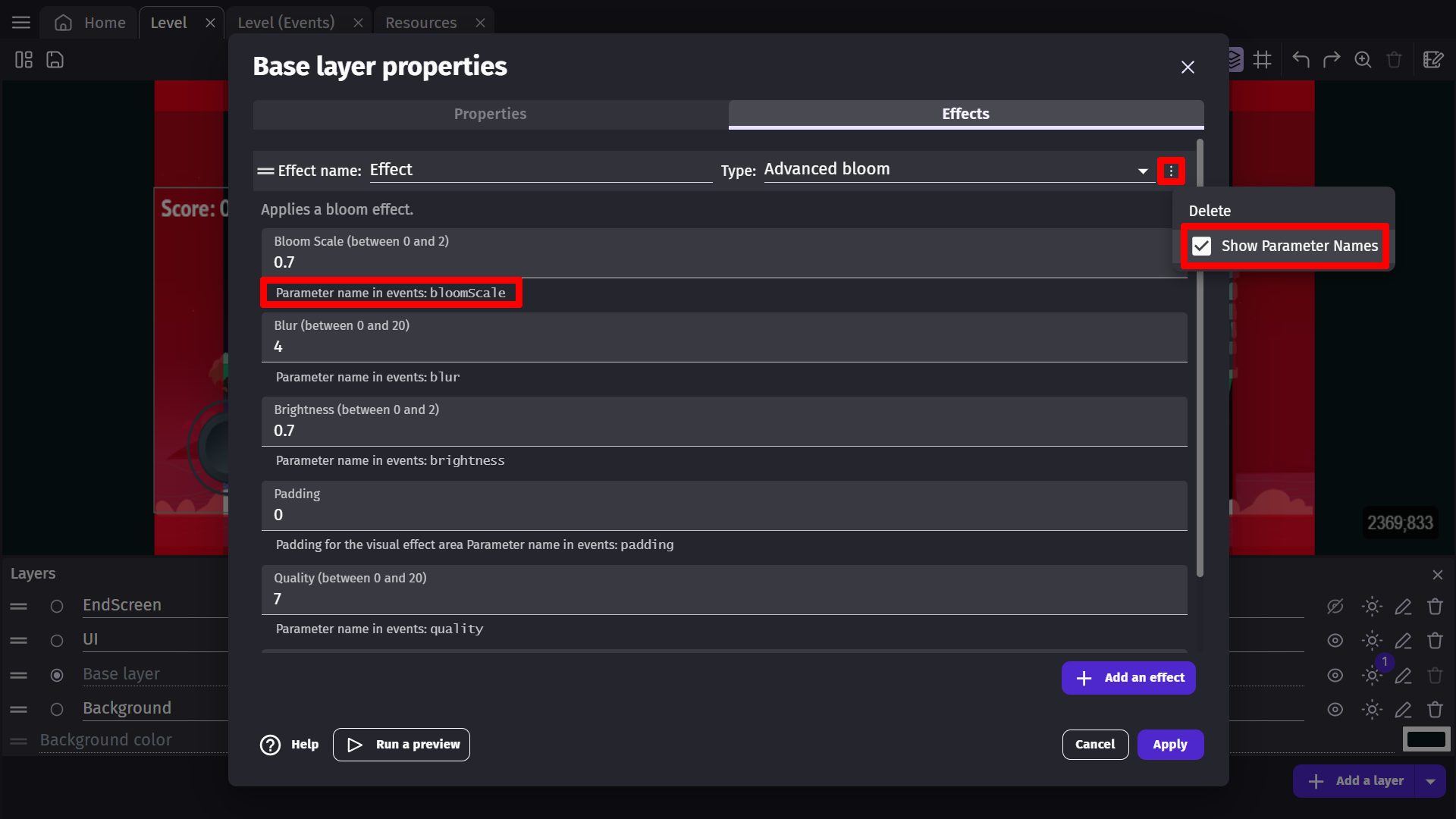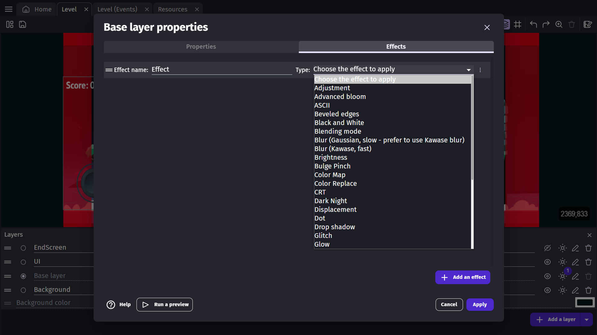 A new layer effect is named "Effect" when created. This name will be useful later for modifying the parameters of the effect during the game.