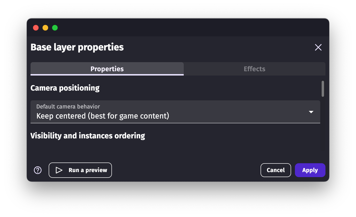 • The camera of the layer stays centered when the game window is resized. This is usually useful for game content or menus