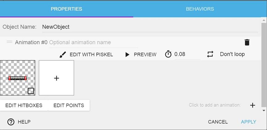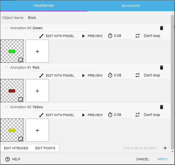 - Name this object Brick. Give it three separate animations using the brick-green.png, brick-red.png and brick-yellow.png files from your project folder. Name the animations accordingly.