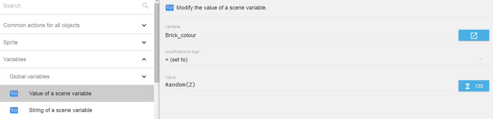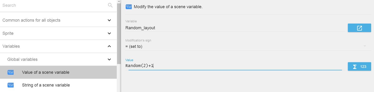 - In the Name of the external layout field, type "Layout" + ToString(Variable(Random_layout)). This will randomly add one of the external layouts to the scene.