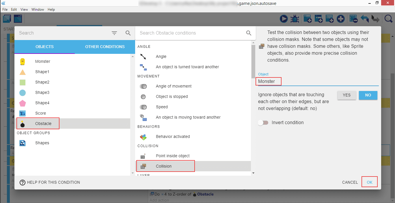 Choose "Obstacle", "Collision", "Monster". This way the bombs will collide with the Monster, and we will be able to subtract the current number of lives when this happens.