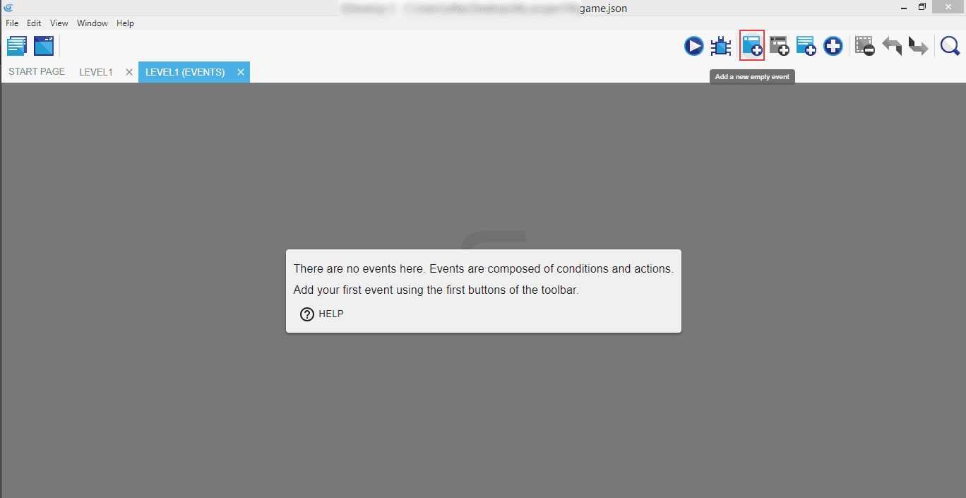 The events list is empty at the beginning - the popup message explains that events are composed of conditions and actions.