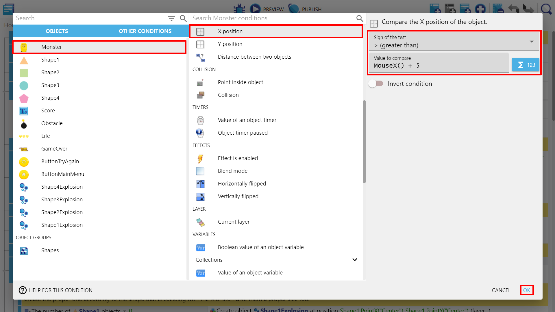 5is an offset in pixels, so the Monster won't be jumping between both states if it will be clicked or touched in the center (you'll see how it's useful by doing the next event).