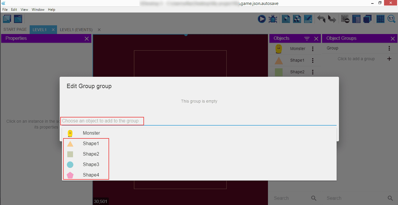 Click on "Choose an object to add to the group", and then select all four shapes.