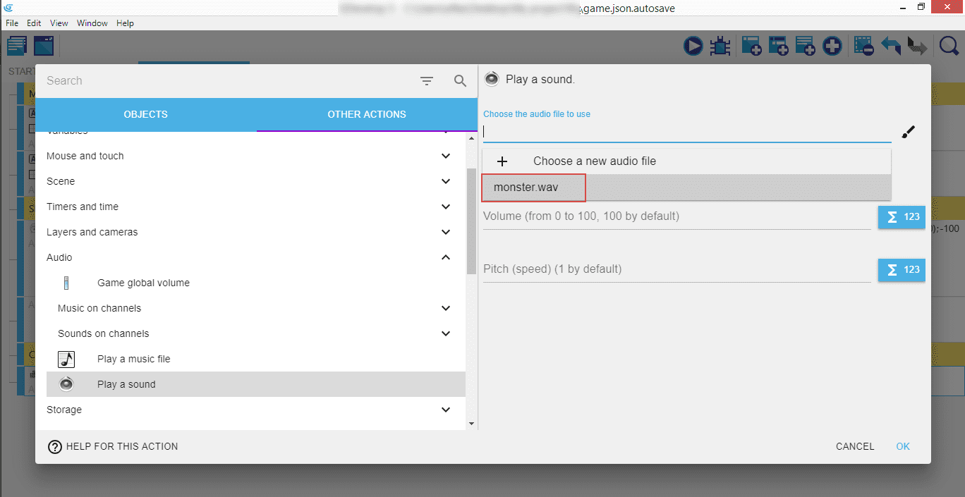 It will open a popup where you'll be able to choose and load an audio file that will be played when the shape will be collected by the Monster. For us, it's called monster.wav.