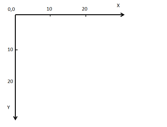 Most 2D engines work in this manner. We start at the top left corner which is coordinate 0,0. We increase the first coordinate number going right as we follow on the X-axis. and we increase the second coordinate number going downward on the Y-axis. You can see how this is applied in the image above.