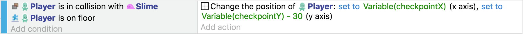 The condition now stores the X and Y position of the "checkpoint" object with which our "Player" object has collided. So, instead of deleting the "Player" sprite object, we set its X and Y positions using the variables.