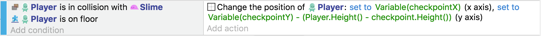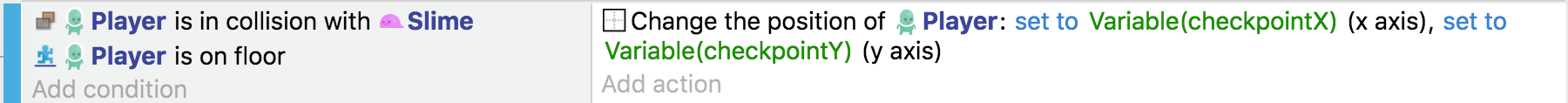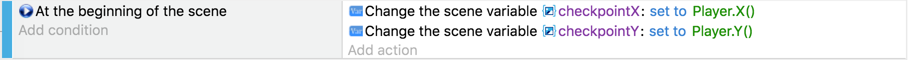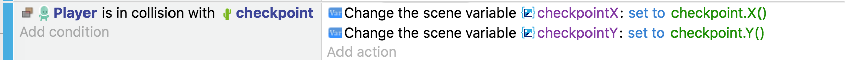 Now that we have the "checkpoint" objects in our scene, let's add the events. We start with a condition to check to see if there is a collision between the "player" and the "checkpoint". If the collision occurs, we store the X and Y position of the "checkpoint" object sprite into a scene variable called checkpointX and checkpointY.