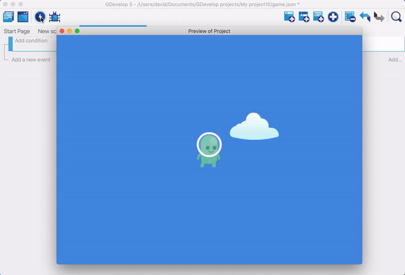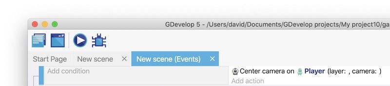 To make the camera follow the player, you need to create an event. In GDevelop, events let you define cause and effect, so when something happens (cause) you can trigger something else to happen (effect).