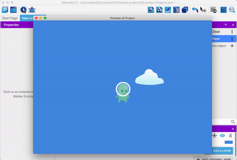 If you preview the game, you can't control the "Player" object. This is because, by default, objects don't do anything. To make objects do something, you need to assign one or more behaviors to them.