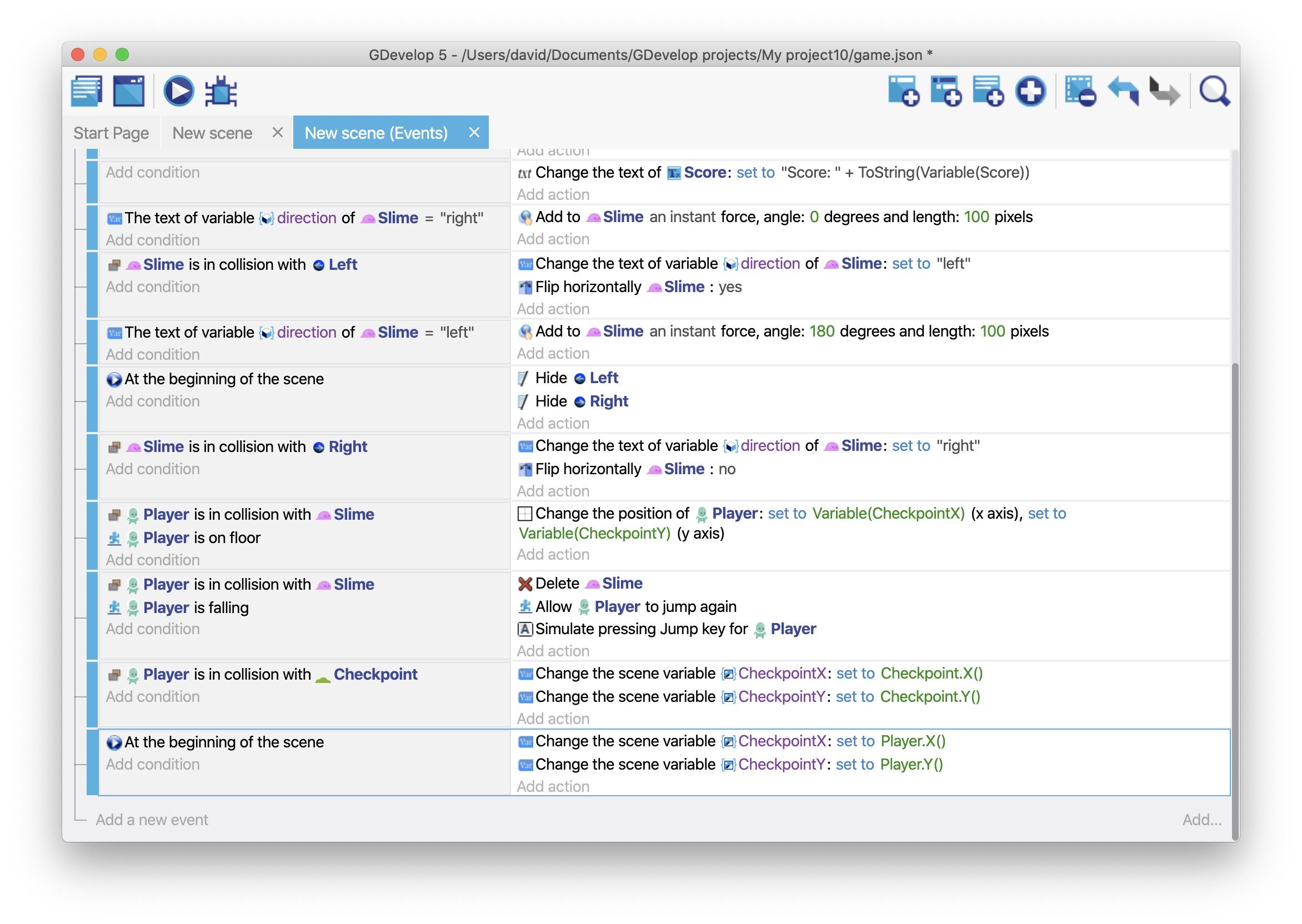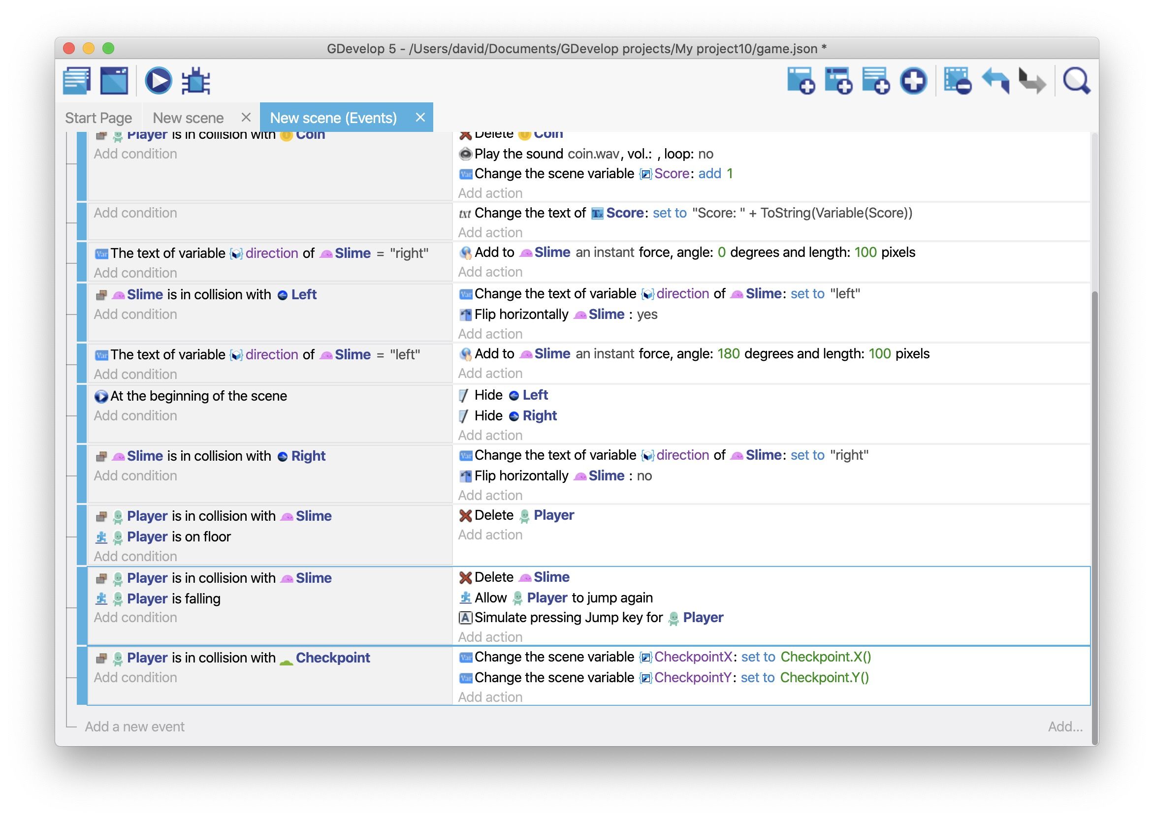 When the "Player" object collides with the "Slime" object, the Delete an object action deletes the "Player" object from the scene. But since the game has checkpoints now, it doesn't make sense to delete the "Player" object.
