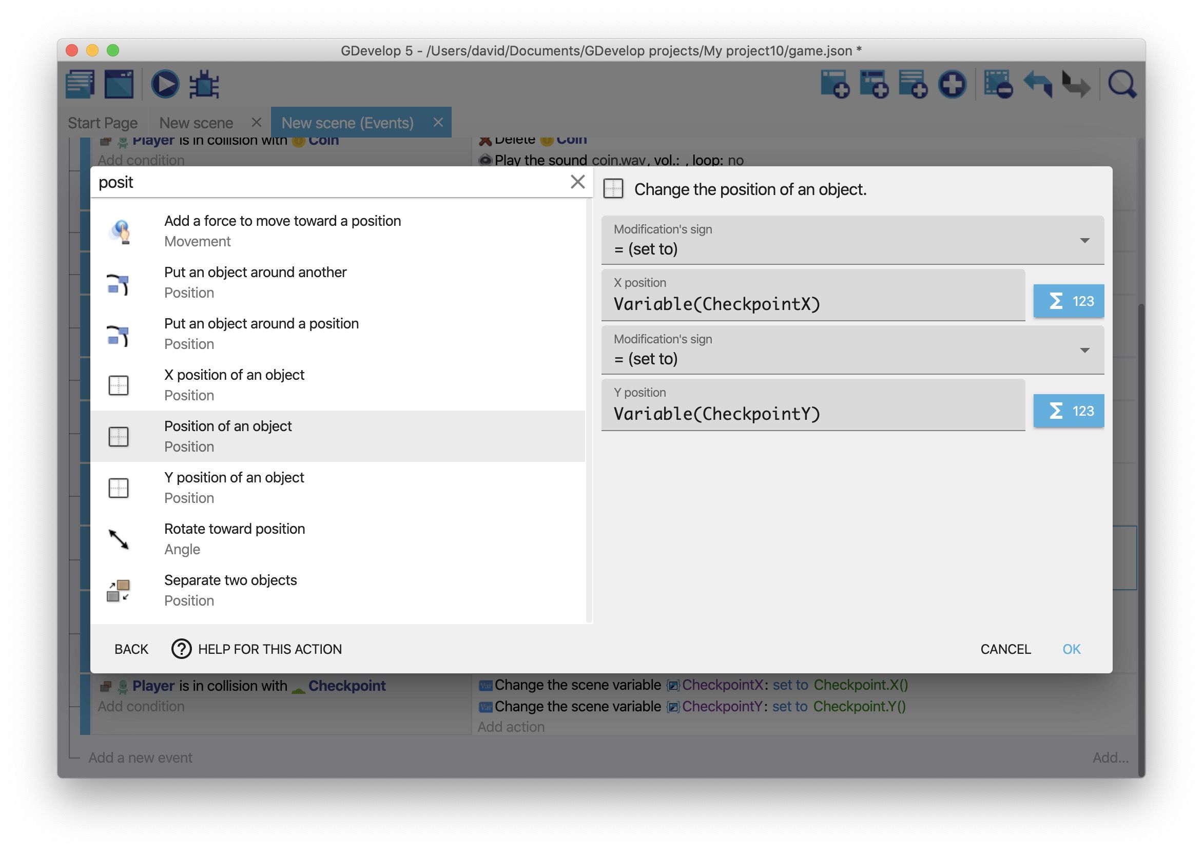 Player.X(). - Create a Value of a scene variable action that creates a "CheckpointY" variable with a value of