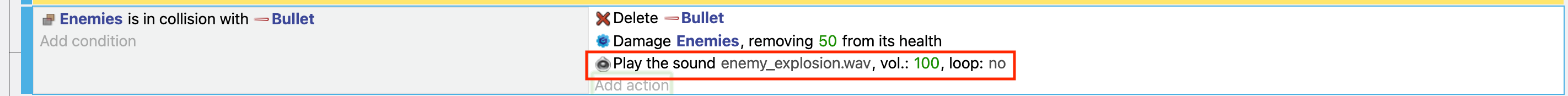 We will add an enemy hit sound effect, which will be played when the player hits the enemy. Go to the Enemies is collision with Bullet event. Add a new action to play a sound. Select "enemy_explosion.waw" from the assets folder, set the volume to 100, and pitch to 1.