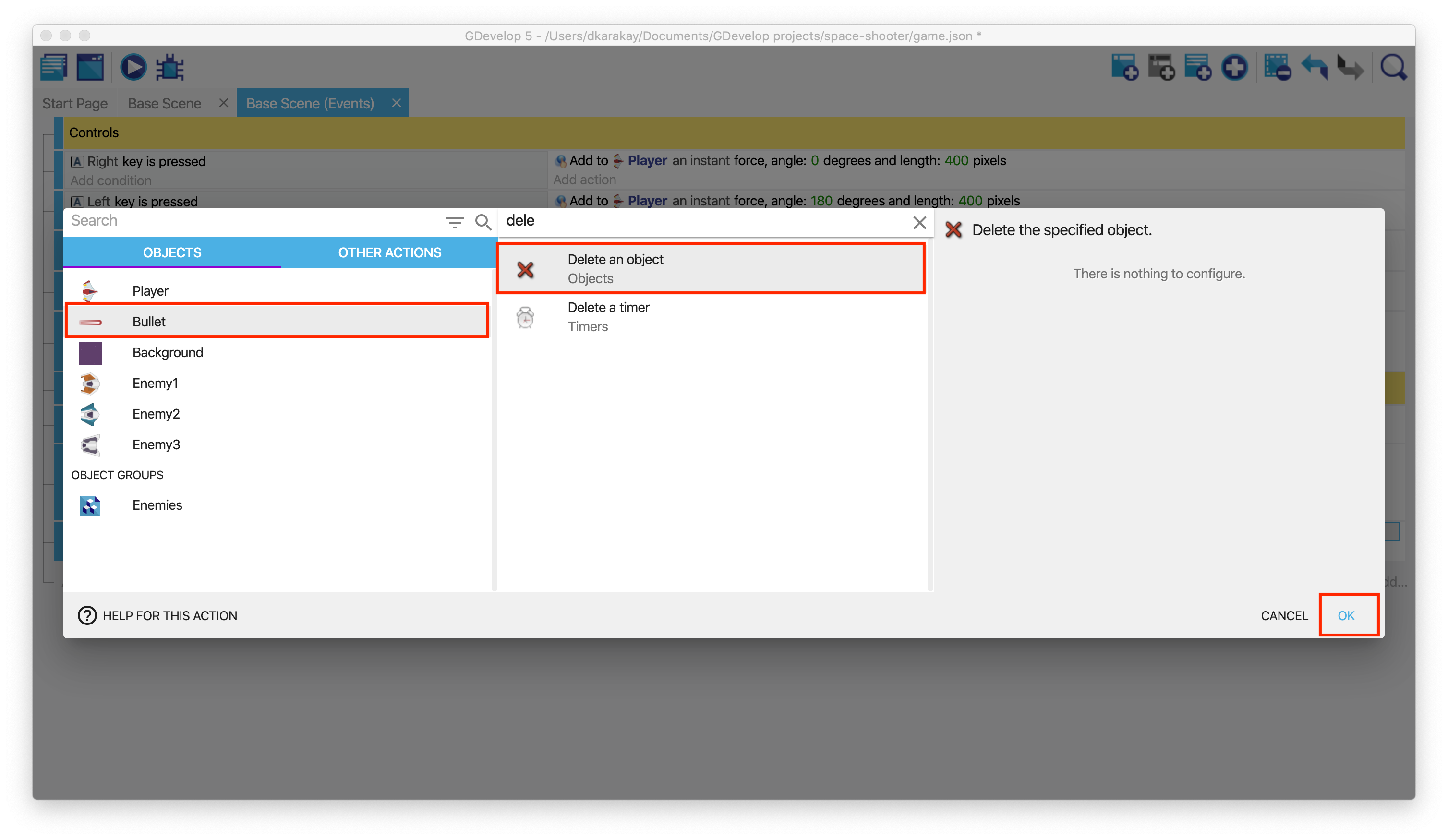 If the enemy is dead, we should delete the scene's object. We will add a new action to delete the object, just like in the previous steps.