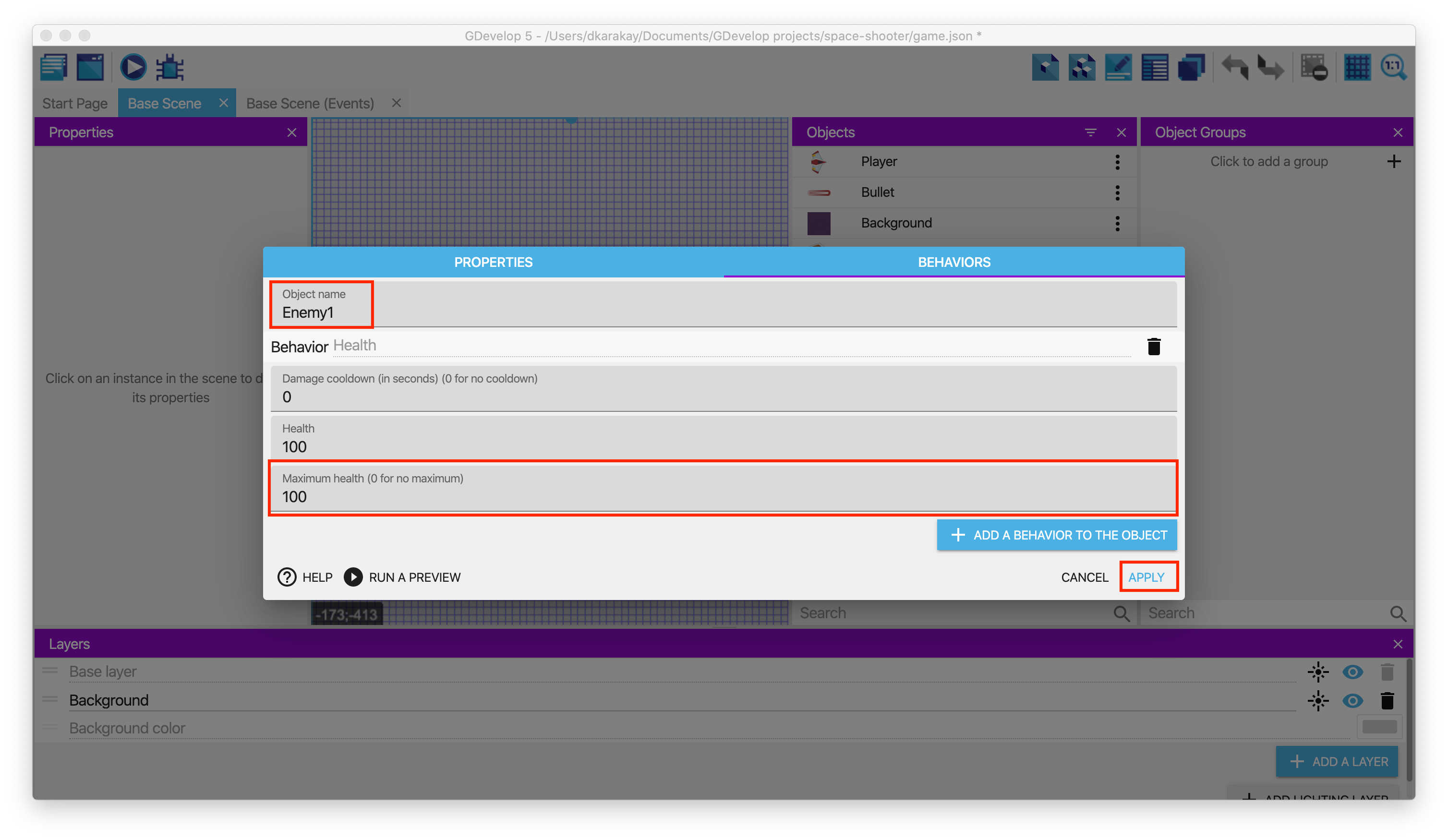 Then, open the behavior page of Enemy1 and leave it as is: Health: 100, Maximum health: 100