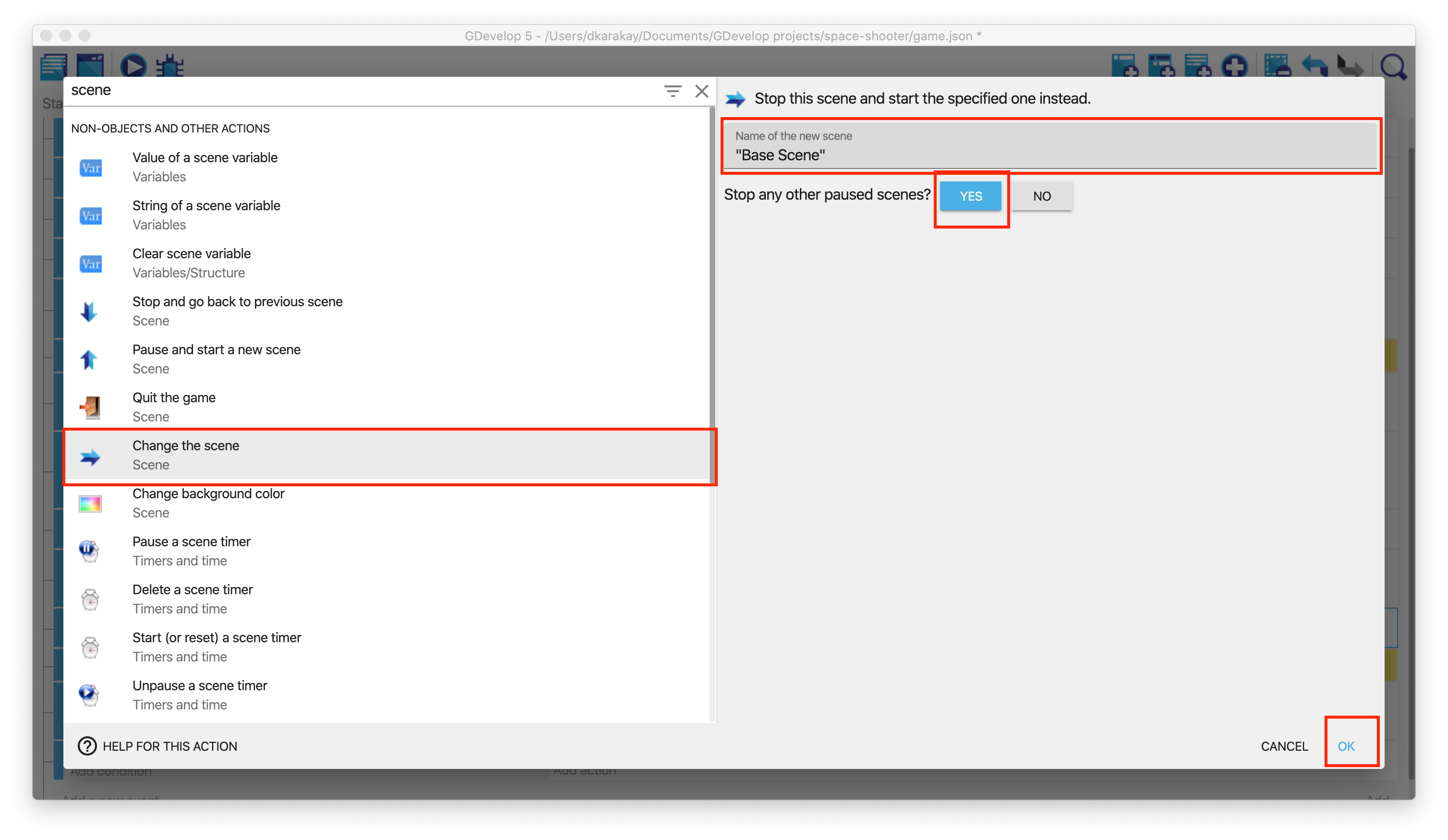 Our game is over when the player is dead. Add a new condition to check the player is dead or not. Then, add an action to restart the game. Type "scene" on the search bar and select Change the scene. Just select the "Base Scene" or your scene's name.
