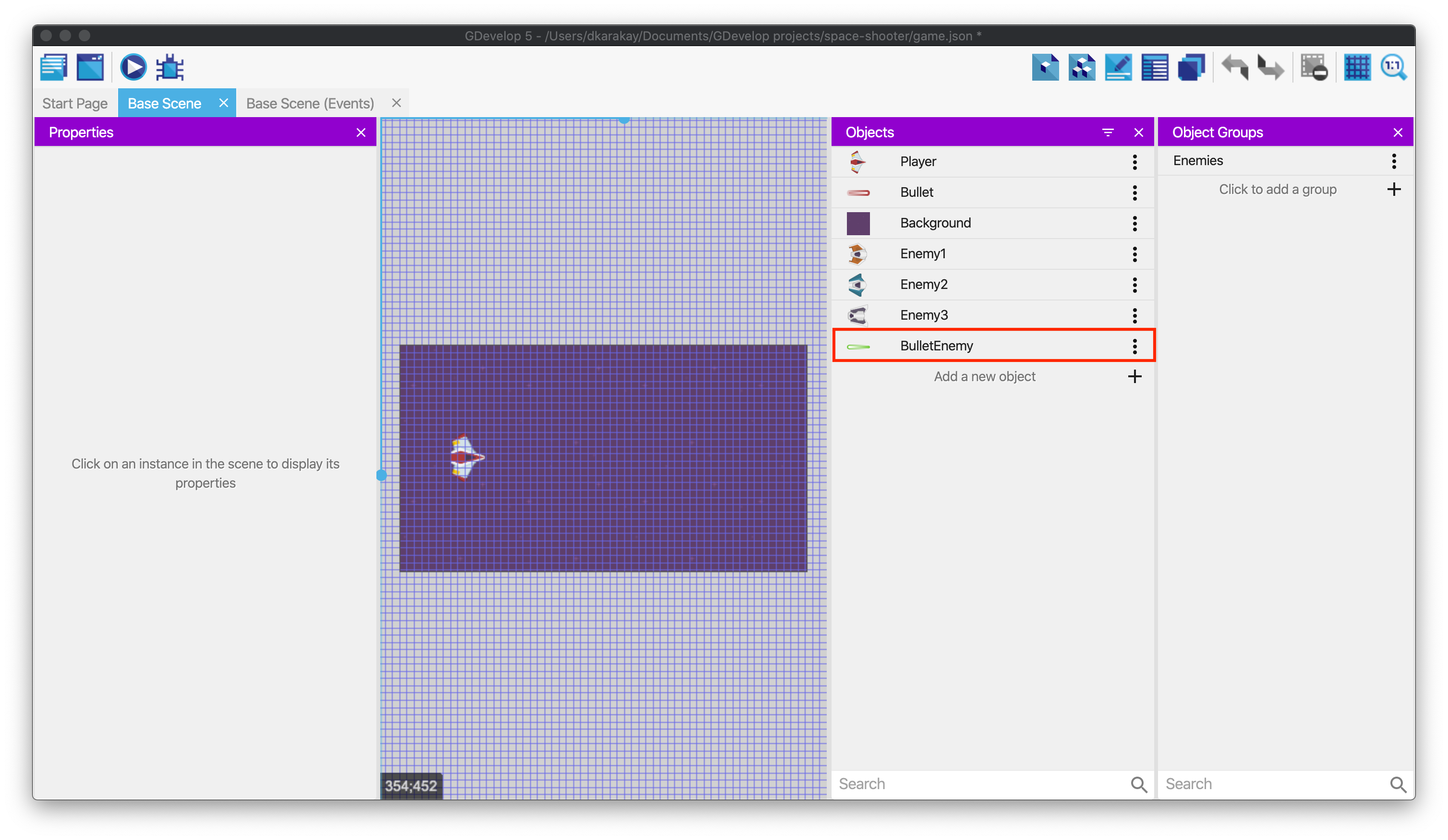 We will add a new bullet object and give the shooting ability to Enemy2, so our enemies can also shoot the player. Add a new object called "BulletEnemy" and select the image as laser_enemy.png from the assets folder.