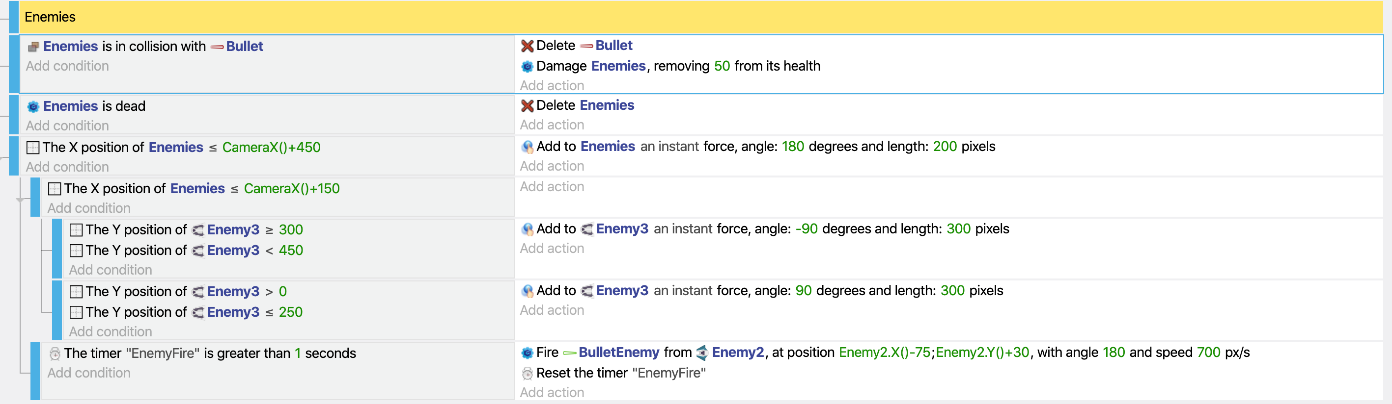 We are ready to add movement to these conditions. Use the Enemies movement action and modify it to move Enemy3 with an angle of -90 and speed of 300.