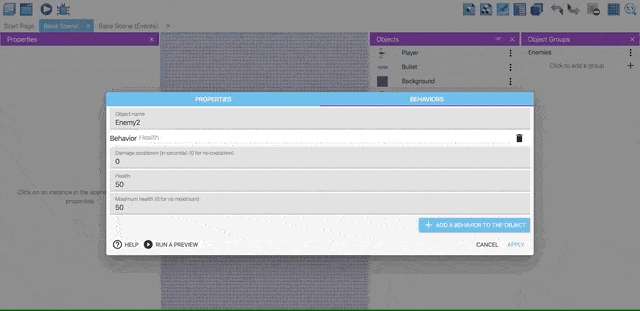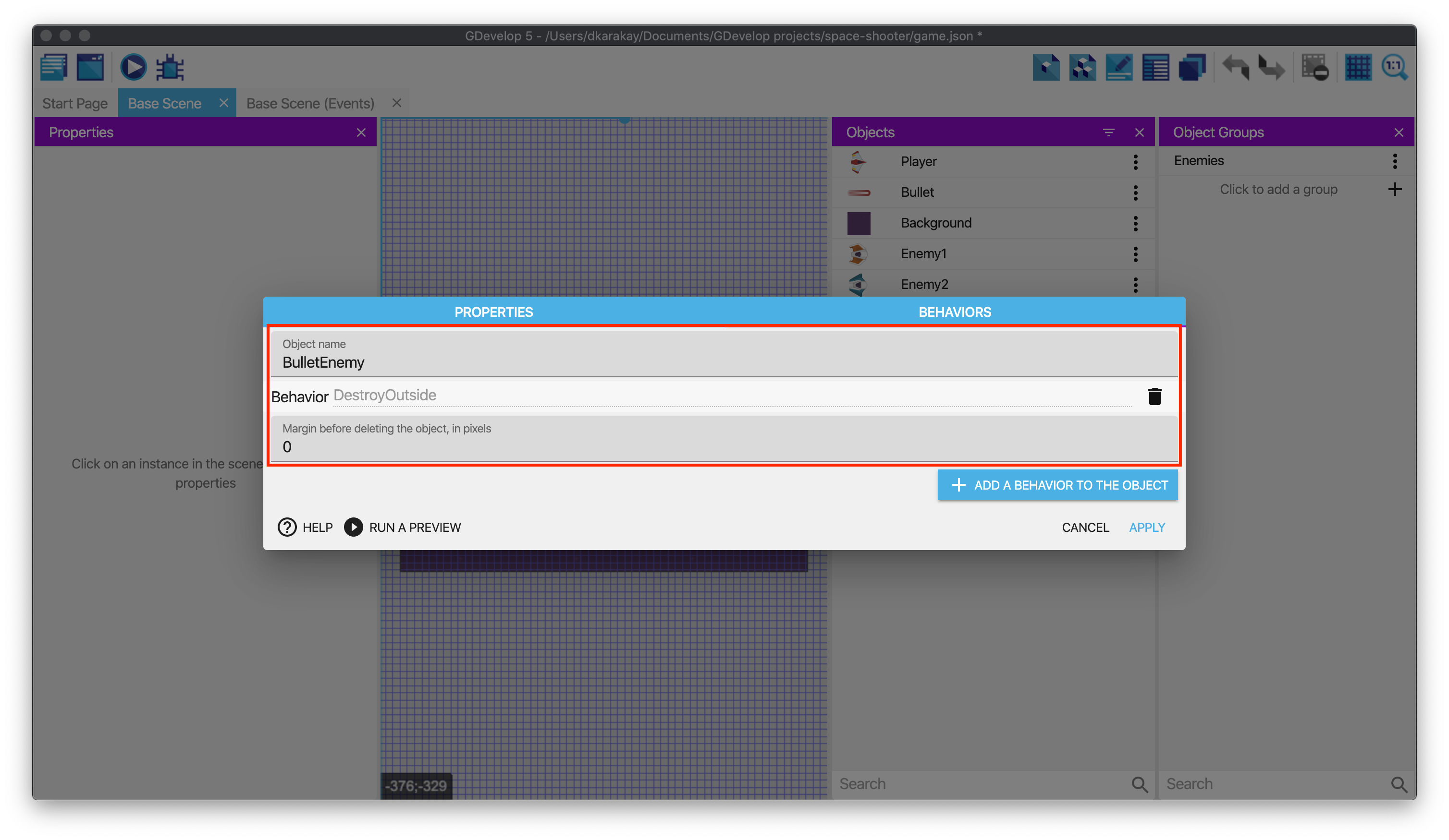Then, add Destroy when outside of the screen behavior to this object. In the end, you should see: