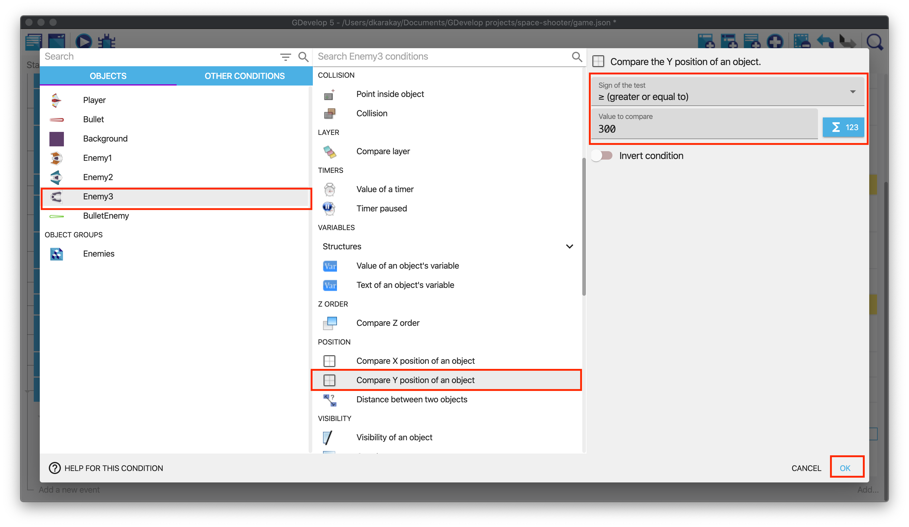 We will add a new mechanic, moving enemy to the center of the screen, to Enemy3. Firstly, we need to have the position of Enemy3. Thus, we will create some conditions to make a move smoothly. Create a new condition in a sub-event (Camera.X()+150). Select Enemy3, Compare Y position and check if the value is greater than or equal to 300.