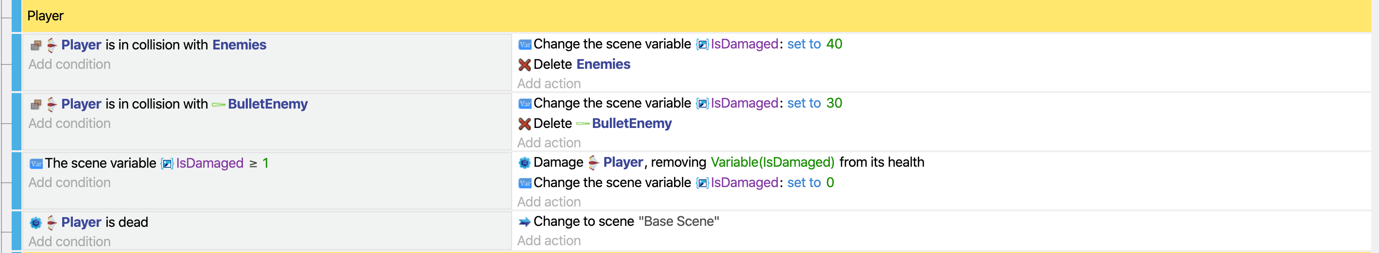 Now, our Enemy2 can fire bullets toward the player. However, we did not define the effect of being shot by these bullets. We will add a new condition to check the collision between the Player and the BulletEnemy. Please select the event and copy-paste it. You need to change the in collision with to BulletEnemy, and change the IsDamaged value to 30. Finally, change deleting Enemies to BulletEnemy objects.