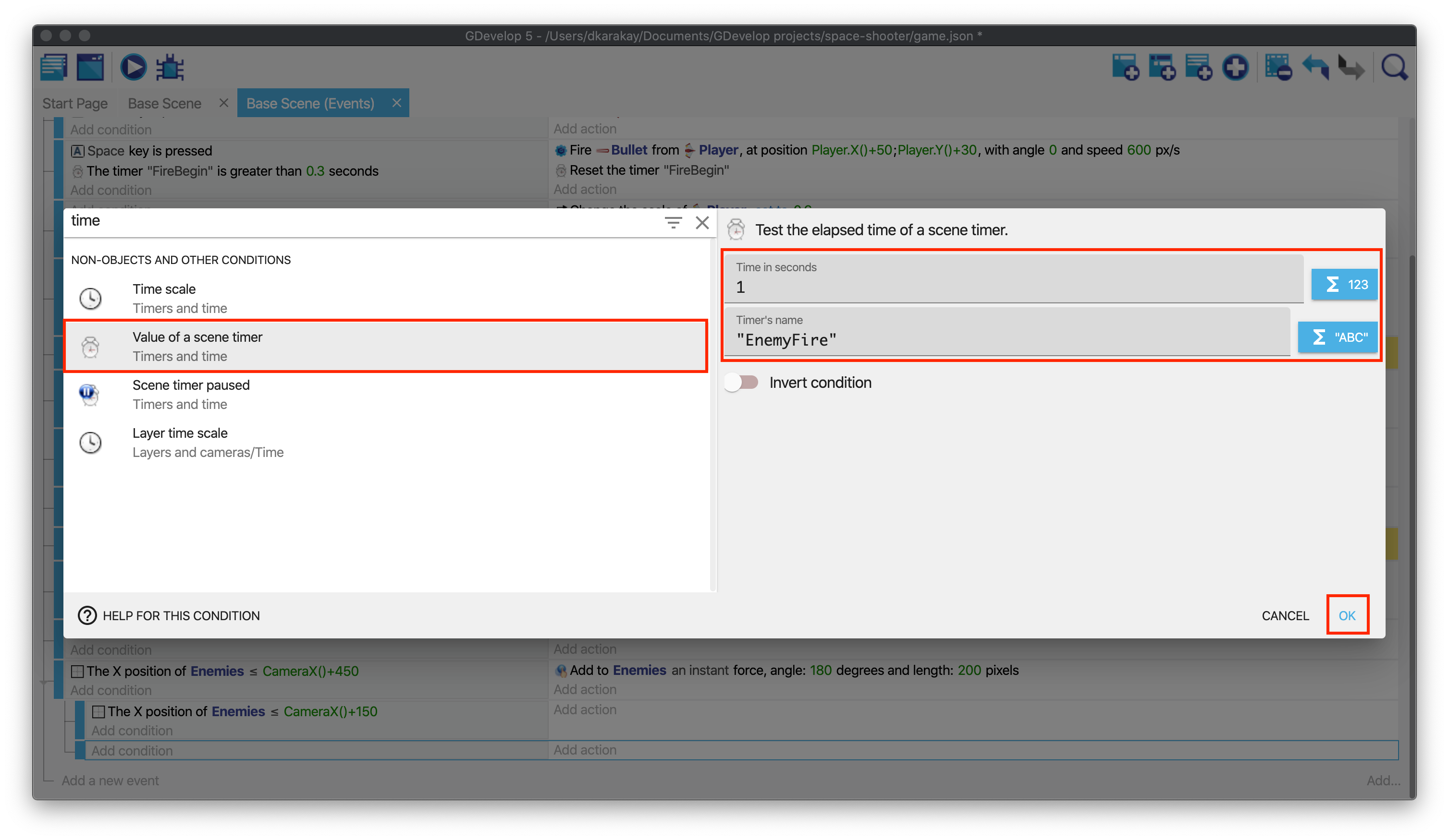 Then, create a new condition in a sub-event condition under the original condition to check the scene timer's value. Fill the time in seconds with 1 and the timer's name with EnemyFire.