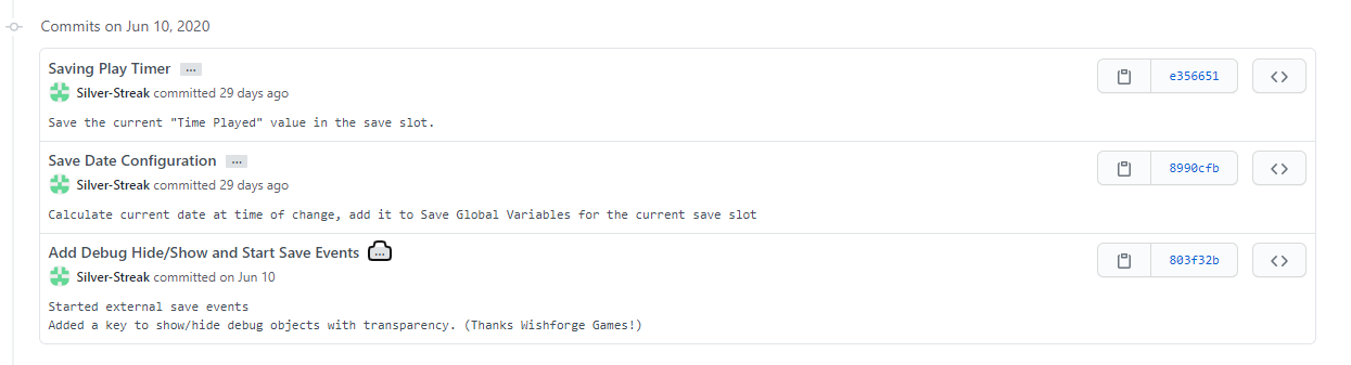 - Going forward, new branches should be created as the game project moves on to each new feature or bugfix. Because Github allows for restoring the game code only to different commits, commits to branches should be completed frequently. Here are some examples of how frequently commits are completed in just one day, along with descriptions to easily identify what is changed: